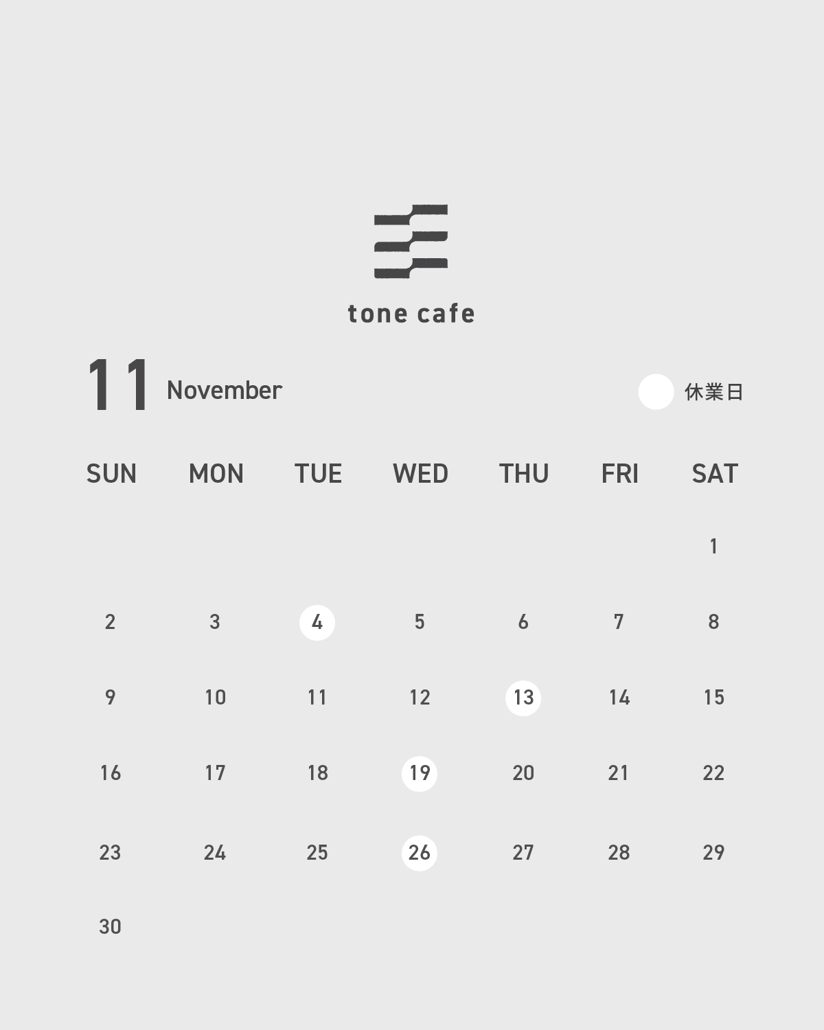 4日(火)、13日(木)、19日(水)、26日(水)
