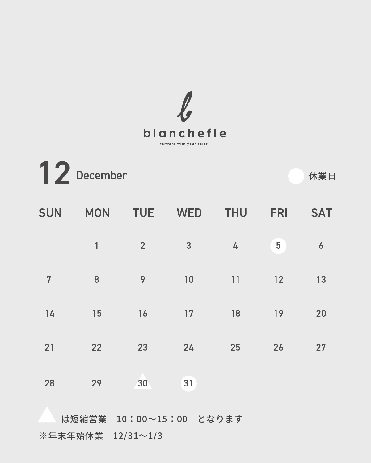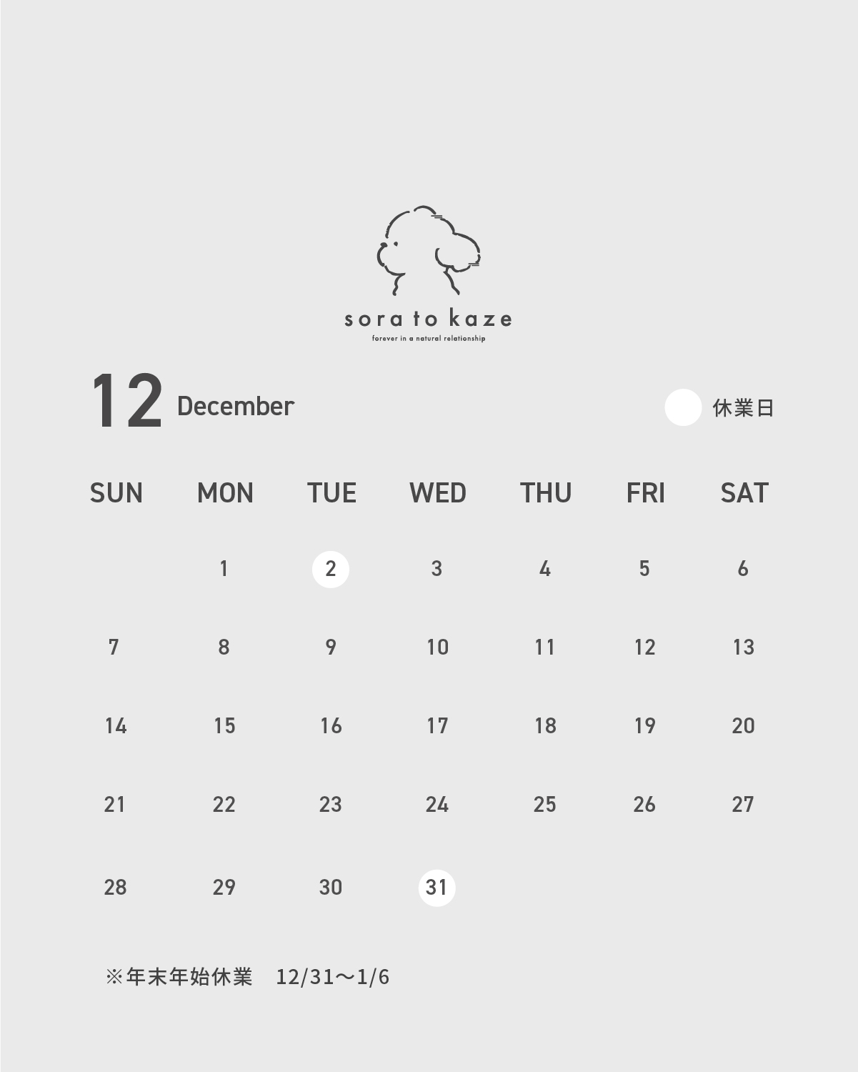 12月と年末年始の各店舗の休業日をお知らせいたします。